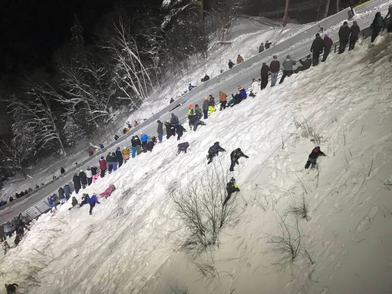 The tournament starts at noon and we have three jumping on the 10 and two jumping on the 30. Today I have split my judging gig with Kim Larson so she judges the small hills and I take over after watching Talia on the 10 meter. She had the longest jump in her class of 8 meters so she is happy with how she did. I make my trek up to the 30 and take off my jacket for a while. The sun beating on my face is glorious. Thirty kids fly by on the 30 and ten on the 60 meter. The 60 meter competition is followed by the YMCA that is danced by the jumpers, officials, hill markers, and crowd. This is the best tradition ever! The day ends with a long standing jump on the 60 and me getting my hot chocolate with enhancement in the lower chalet. One must not miss this at Iola!